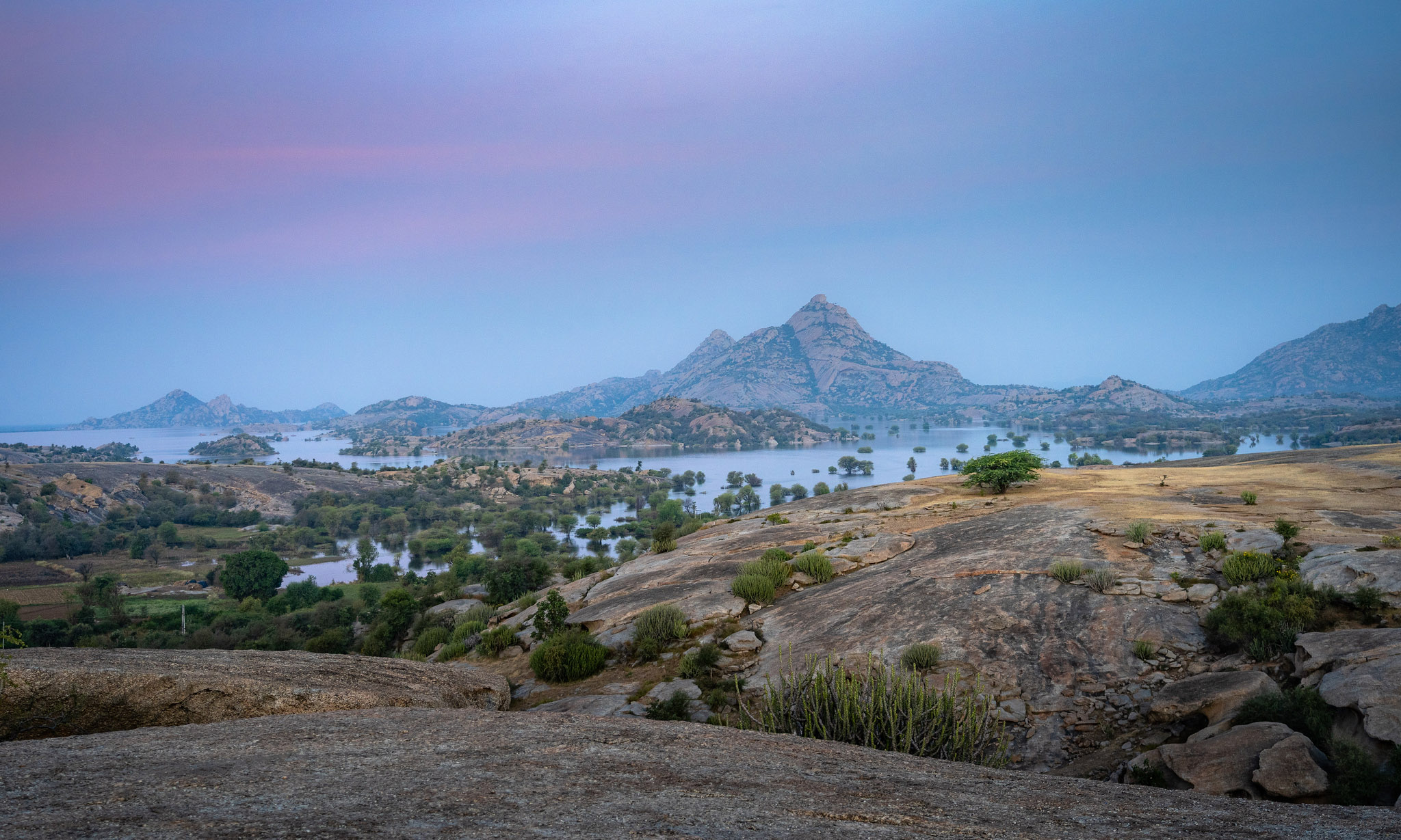 I took this photograph to hold on to a sense of quiet vastness, that moment when the world seems to breathe slowly before the day fully wakes. I looked for a landscape where water and stone could speak to each other, with scattered trees giving scale and fragility to the land.